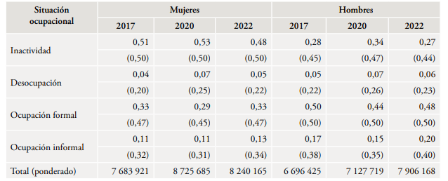 En la tabla 1 se presenta la situación ocupacional de las personas con 15 años o más, según sexo y año. El total de cada año corresponde a las personas en edad de trabajar, según la CASEN. Existen diferencias en la condición de inactividad entre hombres y mujeres. En 2017, 51 % de las mujeres en edad de trabajar se encontraba inactiva, alcanzando un 53 % en 2020, para luego disminuir al 48 % en 2022. En el caso de los hombres, solo el 28 % se encontraba inactivo laboralmente, aumentando a 34 % en 2020 y retrocediendo al 27 % en 2022, después de la pandemia. La tasa de desocupación alcanzó un 7 % para ambos sexos en el año 2020. En el caso de las personas ocupadas, se observa un 33 % de mujeres con ocupación formal en 2017, disminuyendo a 29 % en 2020 y volviendo al 33 % en 2022. Tendencia similar se observa en los hombres, pero con porcentajes más altos, ya que el 50 % de los hombres estaban ocupados formalmente en 2017, el 44 % en 2020 y el 48 % en 2022. Respecto a la informalidad, el 11 % de las mujeres tenía una ocupación informal en 2017 y 2020, aumentando a 13 % en 2022. Los hombres ocupados informales alcanzaron un 17 % en 2017, un 15 % en 2022 y un 20 % en 2022.
