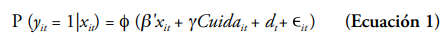 donde yit es una variable binaria que toma el valor 1 si la persona tiene una ocupación informal en el mercado laboral en el año t. En el caso de xit se trata de un vector que contiene las características de la persona i y de su hogar en t: edad, edad de la persona más joven en el hogar, tener pareja, número de personas en el hogar, escolaridad, quintil de ingreso, sector económico en que trabaja (primario, secundario o terciario) y macrozona del país (norte, centro, centro sur, sur).