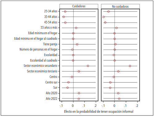 Figura 6. Factores asociados a la probabilidad de informalidad de mujeres, según responsabilidades de cuidado