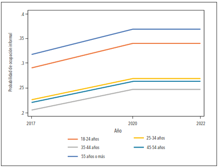 La predicción del modelo para los años anteriores a la pandemia, durante la misma y en el periodo de la pospandemia (figura 8), indica que para todas las edades la probabilidad de informalidad aumentó durante la pandemia y que no ha retornado al nivel que tenía antes de 2017. Esto evidencia la lenta recuperación del mercado y que las políticas laborales deben considerar el ciclo de vida de las personas, dado que los y las jóvenes y las personas mayores presentan la más alta probabilidad de informalidad, sobre el 30 % después de la pandemia.